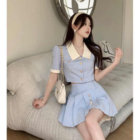 Blue short shirt top + high waist pleated skirt two-piece set PL53504