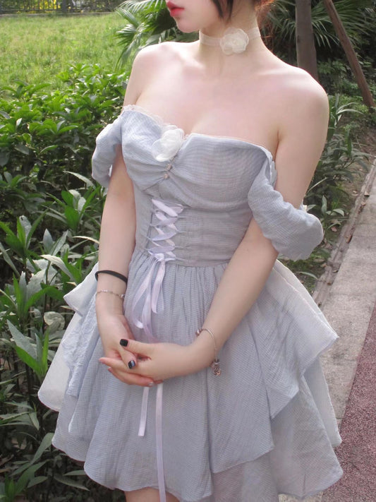 Blue Puff Sleeve Tie Princess Dress PL53366
