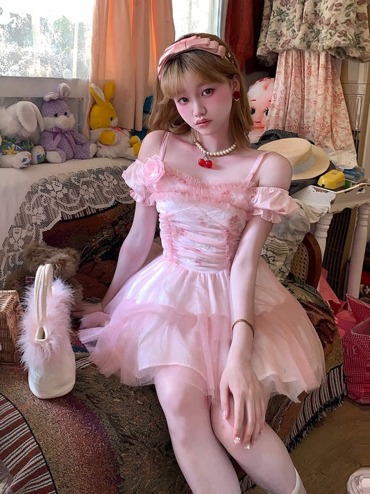 Rosette Embroidery Pink Off-the-shoulder Neckline Dress PL53360