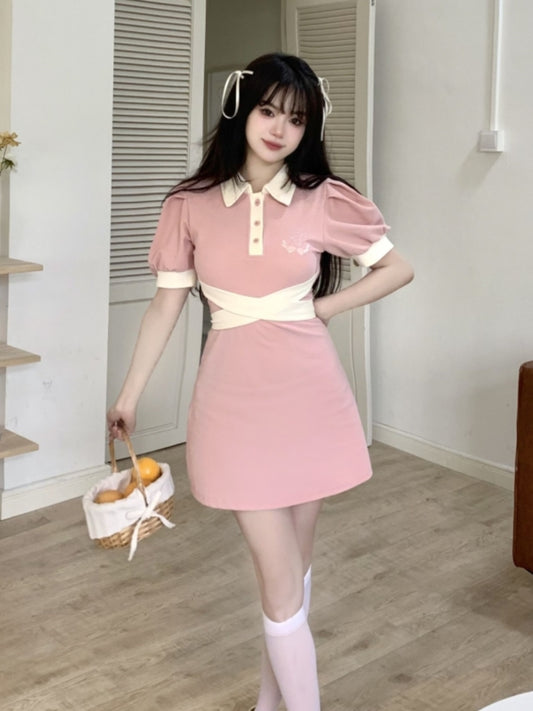polo collar knit bow waist dress PL53361