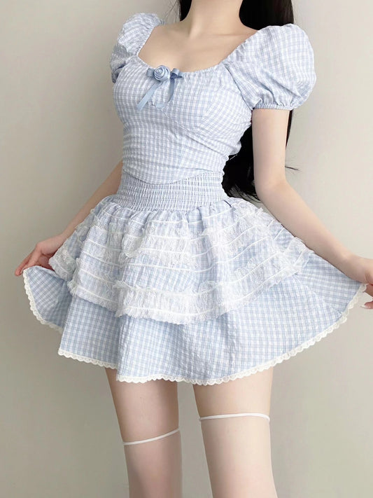 Blue plaid top + high waist tutu skirt two-piece set PL53517