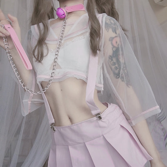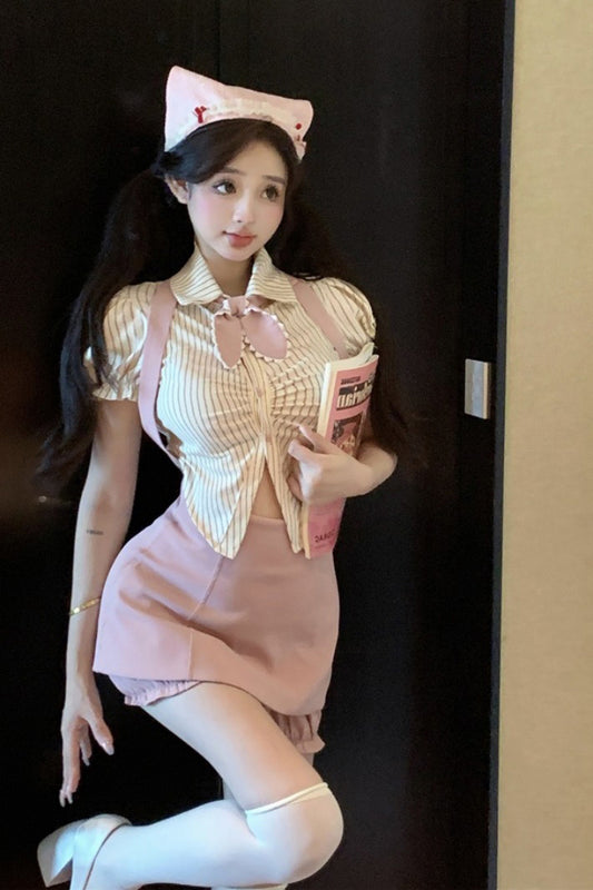 Striped short-sleeved shirt top + high-waist pink suspender skirt PL53424
