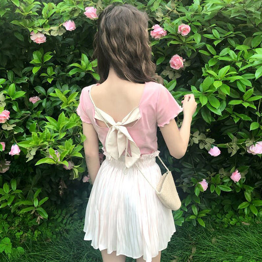 Cute peach blossom T-shirt + white pleated skirt PL51574