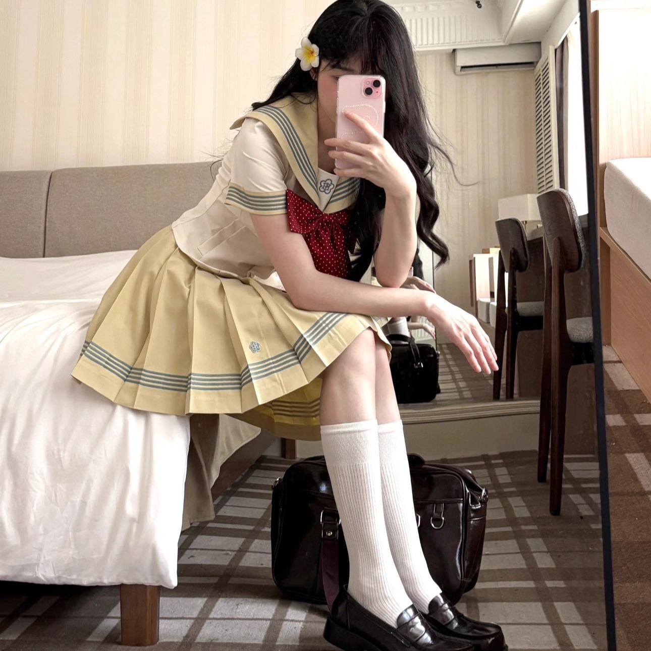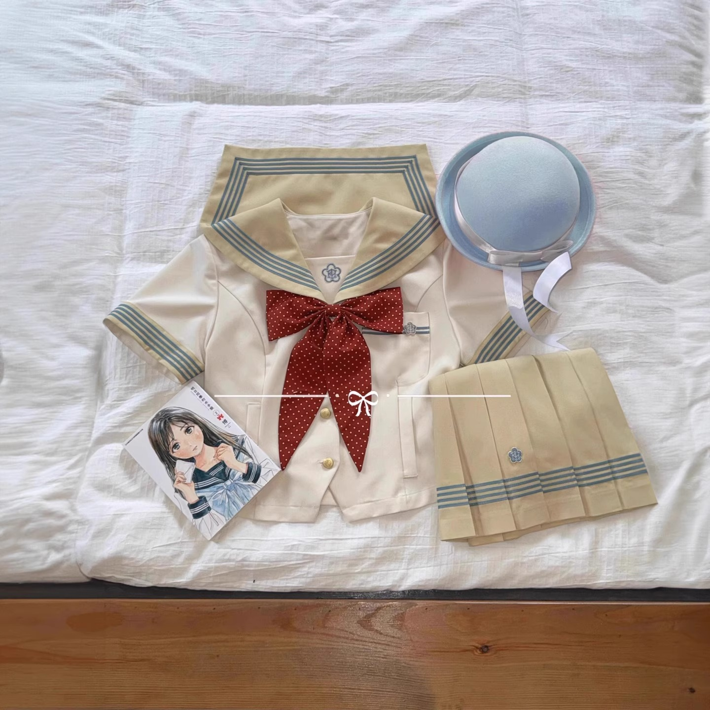 Includes: Includes: short-sleeved top + pleated skirt 42cm + red polka dot bow tie