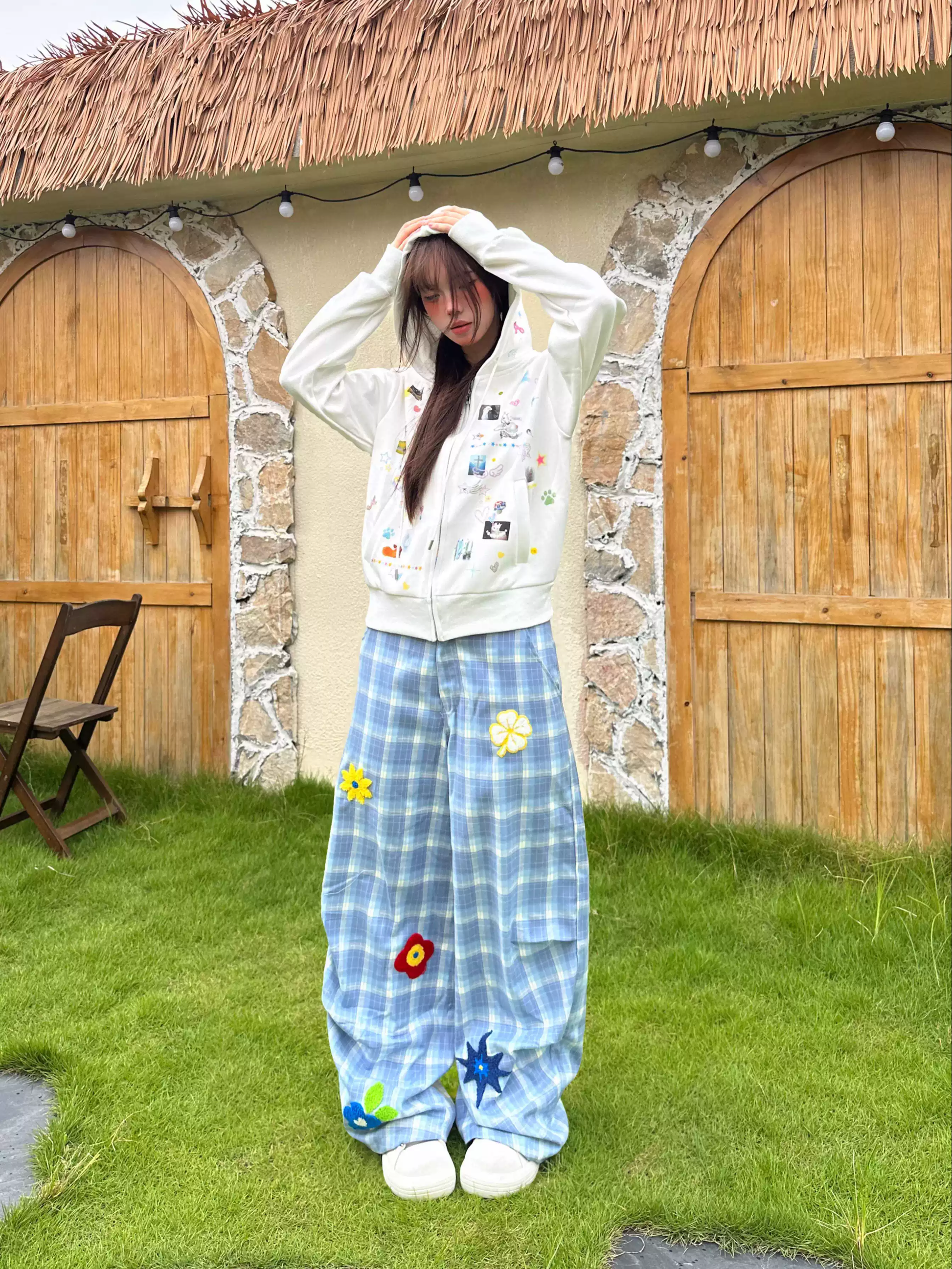 Floral Blue Check Pleated Trousers PA20256