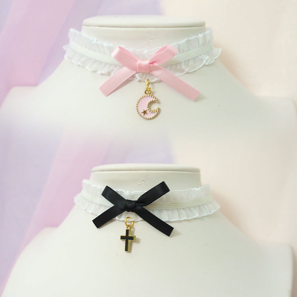 colour:pink flower, black bell, pink cross, black cross, black moon, pink moon
